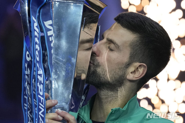 [토리노=AP/뉴시스] 노바크 조코비치(1위·세르비아)가 19일(현지시각) 이탈리아 토리노에서 열린 남자프로테니스(ATP) 투어 '왕중왕전' ATP 파이널스 정상에 올라 트로피를 들고 입 맞추고 있다. 조코비치는 결승에서 야니크 시너(4위·이탈리아)를 2-0(6-3 6-3)으로 완파하고 이 대회 7번째 우승을 차지하며 은퇴한 로저 페더러(스위스)의 6회 우승 기록을 갈아치웠다. 2023.11.20.