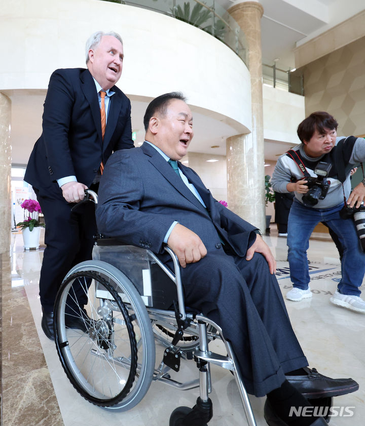 이상민 의원 휠체어 밀며 배웅하는 인요한 혁신위원장