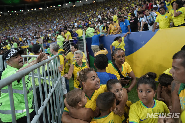 [리우데자네이루=AP/뉴시스] 21일(현지시각) 브라질 리우데자네이루의 마라카낭 경기장에서 2026 국제축구연맹(FIFA) 북중미 월드컵 남미예선 조별리그 6차전 브라질과 아르헨티나의 경기가 열리기 전 양국 팬들이 싸움을 벌여 브라질 여성이 아이들을 보호하기 위해 감싸고 있다. 이 소요 사태로 경기가 약 30분 지연됐다. 2023.11.22.