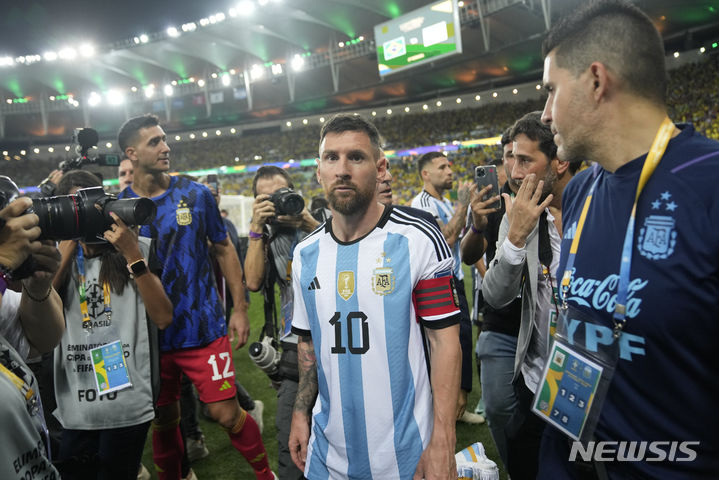 [리우데자네이루=AP/뉴시스] 리오넬 메시 등 아르헨티나 선수들이 21일(현지시각) 브라질 리우데자네이루의 마라카낭 경기장에서 2026 국제축구연맹(FIFA) 북중미 월드컵 남미예선 조별리그 6차전 브라질과 경기가 열리기 전 양국 팬들이 싸움을 벌이자 라커룸으로 들어가고 있다. 이 소요 사태로 경기가 약 30분 지연됐다. 2023.11.22.