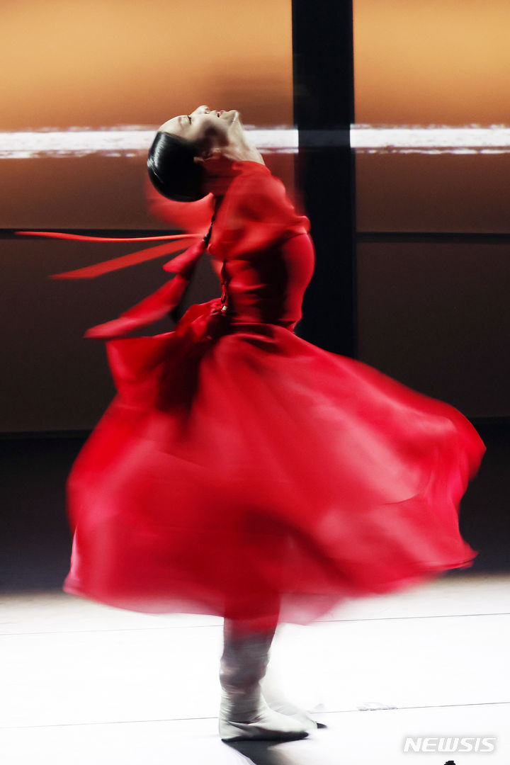 [서울=뉴시스] 박진희 기자 = 국립정동극장 예슬단 정기공연 '암덕: 류(流)의 기원' 언론시연회가 22일 서울 중구 정동극장에서 펼쳐지고 있다. '암덕'은 여성 최초로 남사당패 꼭두쇠(우두머리)로 활약한 바우덕이의 본명 '감암덕'에서 딴 제목으로, 남사당패를 조선 대표 민간예인집단으로 이끌어 낸 그의 뛰어난 재기와 예술혼을 조명하는 동시에 가려저 있던 인고의 시간과 강인함을 담은 스토리를 현대적으로 무대화한 전통 연희극이다. 2023.11.22. [email protected]