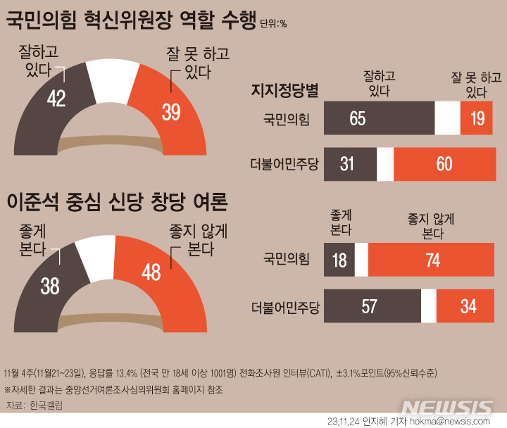 [서울=뉴시스] 한국갤럽이 '이준석 전 국민의힘 대표 중심 신당 창당'에 대해 조사한 결과, 응답자 38%가 '좋게 본다'고 답했다. 48%는 '좋지 않게 본다'고 답했고 14%는 의견을 유보했다. 인요한 국민의힘 혁신위원장의역할 수행을 묻는 조사에서는, 42%가 긍정 평가했다. 부정평가는 39%로 집계됐다. (그래픽=안지혜 기자)