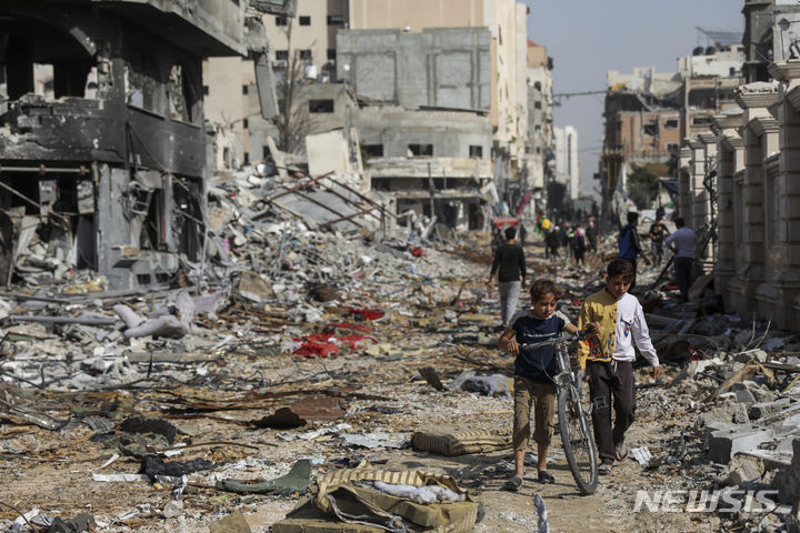 [가자시티=AP/뉴시스] 이스라엘과 하마스의 인도주의 휴전 첫날인 24일(현지시간) 가자지구 최대 도시 가자시티에서 팔레스타인 주민들이 파괴된 거리를 평화롭게 지나고 있다. 2023.11.25.