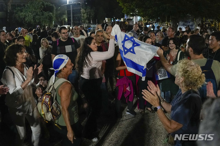 [텔아비브=AP/뉴시스] 이스라엘과 하마스의 인도주의 휴전 첫날인 24일(현지시간) 이스라엘 텔아비브에서 시민들이 하마스에 납치된 이스라엘인들의 일부 석방 소식에 기뻐하고 있다. 2023.11.25.