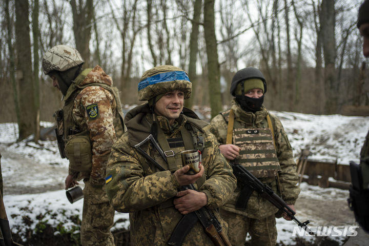 [수미=AP/뉴시스] 24일(현지시각) 우크라이나 동북부 수미에서 우크라이나 국경경비대원들이 차를 마시며 휴식을 취하고 있다. 러시아군이 지난해 봄 수미에서 철수했지만, 러시아와 인접한 수미주는 여전히 공격받을 위험을 안고 있다. 2023.11.25.