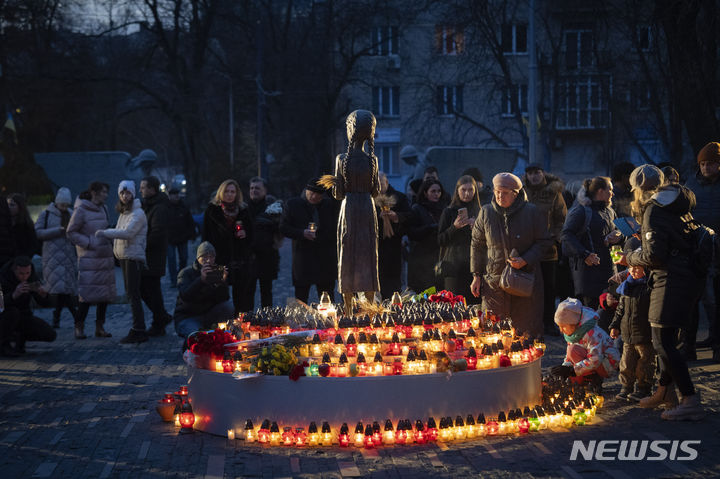 [키이우=AP/뉴시스] 25일(현지시각) 우크라이나 키이우 시민들이 1932~33년 대기근(홀로도모르) 희생자들을 기리는 기념비에 촛불을 밝히고 있다. 홀로도모르는 1932~33년 이시오프 스탈린 치하 소련 시대에 자행된 대기근으로 기록이 부실해 집계에 편차가 있지만 대체로 250만~300만 명 정도가 숨진 것으로 추산된다. 2023.11.26.