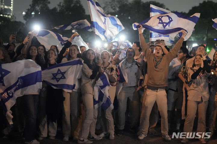 [페타티크바=AP/뉴시스] 이스라엘 사람들이 26일(현지시각) 가자지구에서 풀려난 인질들을 태운 헬리콥터가 이스라엘 페타티크바의 슈나이더 어린이 병원에 착륙하는 것을 보면서 환호하고 있다. 하마스는 추가 인질 교환을 위해 이스라엘과의 휴전을 2~4일간 연장할 용의가 있다고 밝힌 것으로 알려졌다. 2023.11.27.