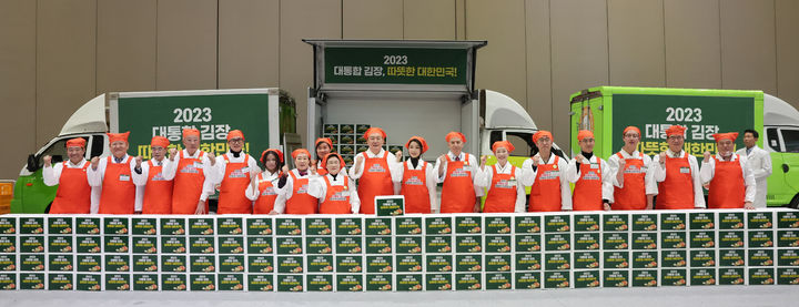 [고양=뉴시스] 윤석열 대통령과 부인 김건희 여사가 27일 경기 고양시 킨텍스에서 열린 나눔과 봉사의 국민 대통합 김장 행사에서 소외계층에 전달할 김장 김치 박스를 놓고 기념촬영을 하고 있다. (사진=대통령실 제공) 2023.11.27 [email protected] *재판매 및 DB 금지