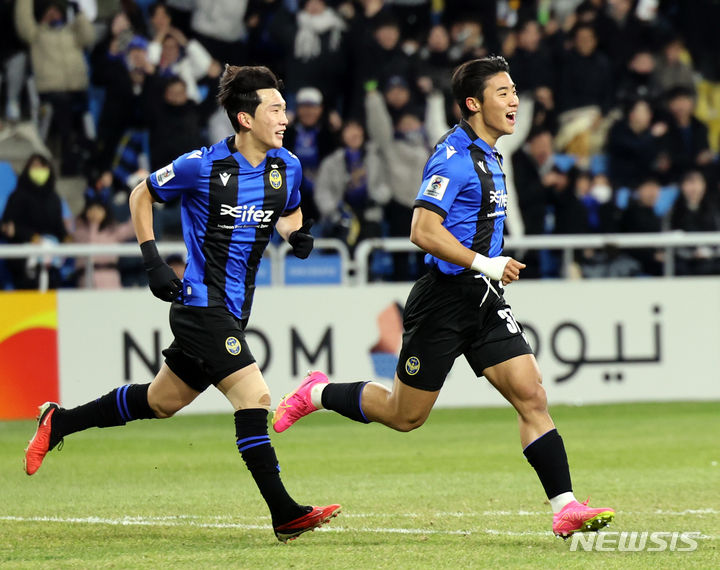 [인천=뉴시스] 김근수 기자 = 28일 인천 중구 인천축구전용경기장에서 열린 AFC 챔피언스리그 G조 조별리그 5차전 인천 유나이티드와 요코하마 F.마리노스의 경기, 전반 인천 유나이티드 홍시우가 선취 득점에 성공하고 세리머니를 하고 있다. 2023.11.28. [email protected]