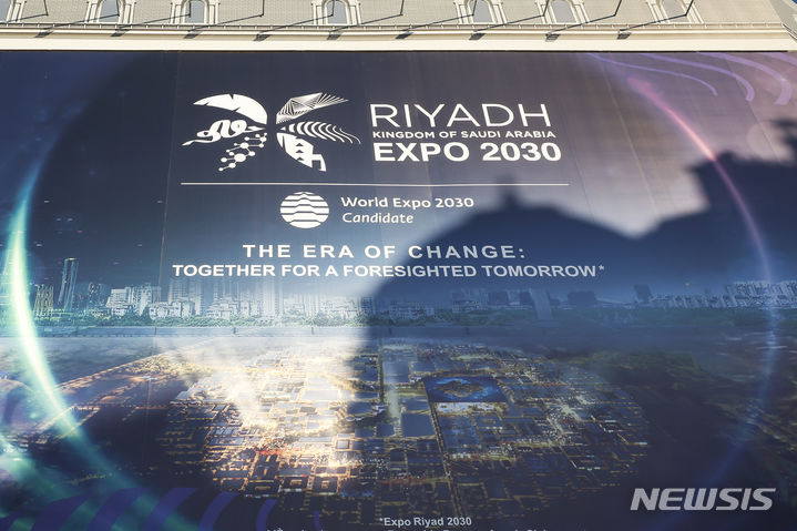 [파리=AP/뉴시스] 28일(현지시각) 프랑스 파리에서 개조 중인 한 건물에 사우디아라비아 리야드 엑스포 2030 홍보물이 덮여 있다. 이날 파리 외곽 팔레 데 콩그레 회의장에서 제173차 국제박람회기구(BIE) 총회 후 열린 2030년 세계박람회 개최 도시 투표에서 사우디 리야드가 119표, 한국 부산이 29표, 이탈리아 로마가 17표를 얻어 리야드의 개최가 확정됐다. 2023.11.29.