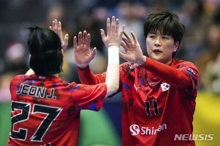 [스타방에르=AP/뉴시스] 유은희(오른쪽)가 29일(현지시각) 노르웨이 스타방에르의 DNB 아레나에서 열린 국제핸드볼연맹(IHF) 제26회 세계여자핸드볼선수권대회 첫날 조별리그 C조 1차전 오스트리아와 경기 중 득점 후 기뻐하고 있다. 한국은 경기 막판 페널티 슛을 내주며 29-30, 1골 차로 아쉽게 패했다. 2023.11.30.