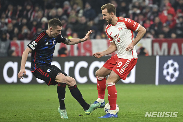 [뮌헨=AP/뉴시스] 바이에른 뮌헨의 해리 케인(오른쪽)이 29일(현지시각) 독일 뮌헨의 알리안츠 아레나에서 열린 2023-24 유럽축구연맹(UEFA) 챔피언스리그(UCL) 조별리그 A조 5차전 FC코펜하겐(덴마크)와 경기 중 공을 다투고 있다. 김민재가 휴식한 뮌헨은 0-0 무승부를 기록해 연승 행진을 마감했다. 2023.11.30.