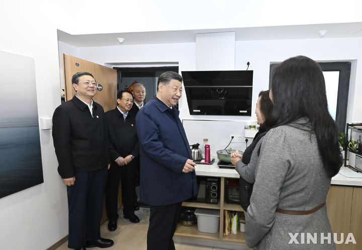 [상하이=신화/뉴시스] 시진핑 중국 국가주석이 29일(현지시각) 상하이의 정부 보조 임대주택 공동체를 방문해 환영나온 주민들과 인사하고 있다. 코로나19 이후 3년 만에 상하이를 방문한 시 주석은 과학기술 혁신 전시회장, 상하이 선물 거래소 등을 시찰했다. 2023.11.30.