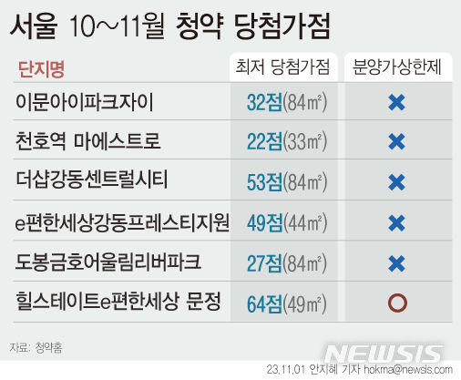 [서울=뉴시스] 청약 시장에서 분양가에 따른 당첨 가점 양극화 현상이 뚜렷해지고 있다. 서울에서도 분양가 상한제가 적용된 인기 단지와 고분양가 논란이 불거진 단지 간 당첨 가점 차가 크게 벌어지는 널뛰기 양상이 나타나고 있다. (그래픽=안지혜 기자)