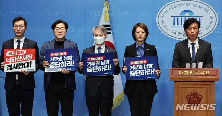 [서울=뉴시스] 추상철 기자 = 더불어민주당 과방위 및 언론자유특위가 1일 오전 서울 여의도 국회에서 '방송법 거부권 및 이동관 방통위원장 사의 표명'과 관련 기자회견을 하고 있다. 2023.12.01. [email protected]