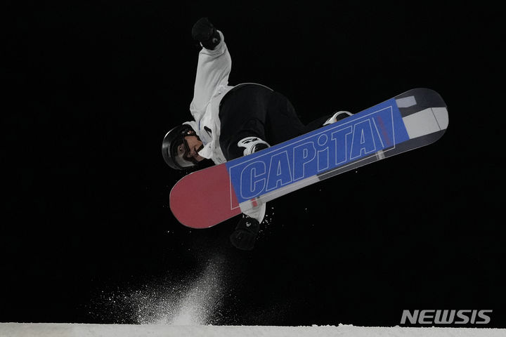 [베이징=AP/뉴시스] 이동헌이 2일(현지시각) 중국 베이징에서 열린 2023-24 국제스키연맹(FIS) 스노보드 월드컵 남자 빅에어 결선 경기를 펼치고 있다. 이동헌은 110.00점으로 9위를 기록했다. 2023.12.03.