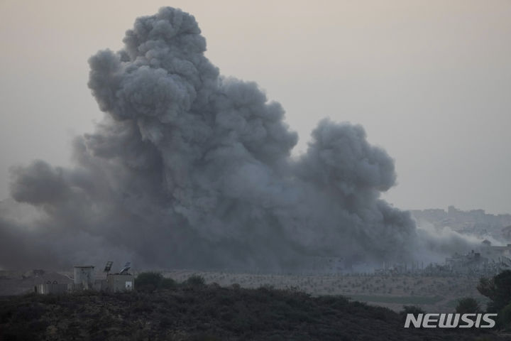 [가자지구=AP/뉴시스] 2일(현지시각) 이스라엘의 폭격으로 가자지구에서 연기가 피어오르고 있다. 이스라엘과 하마스가 전투를 재개해 이스라엘군이 대대적으로 가자지구 남부 공세에 나섰다. 2023.12.03.