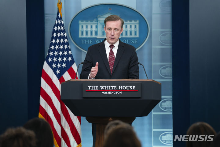 [워싱턴=AP/뉴시스] 제이크 설리번 백악관 국가안보보좌관이 4일(현지시각) 백악관에서 언론 브리핑을 하고 있다. 설리번 보좌관은 지난 3일 중동 홍해에서 미 구축함과 상선들이 받은 공격은 예멘 반군 '후티'의 소행으로 그 배후에는 이란이 있다고 지목했다. 2023.12.05.