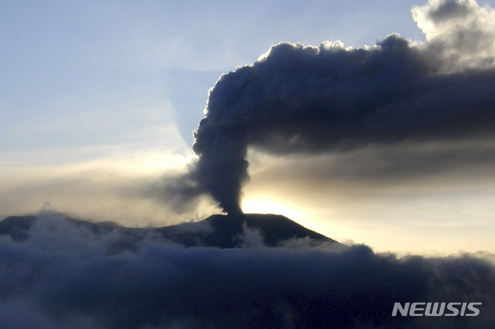 [수마트라=AP/뉴시스] 5일(현지시각) 인도네시아 수마트라섬 므라피 화산이 화산재를 뿜어내고 있다. 분화 3일째, 화산이 다시 폭발하면서 인도네시아 구조 당국은 등반객에 대한 수색을 중단했다. 현지 관계자는 므라피 화산이 뿜어낸 화산재가 800m 높이까지 달한다고 전했다. 2023.12.05.