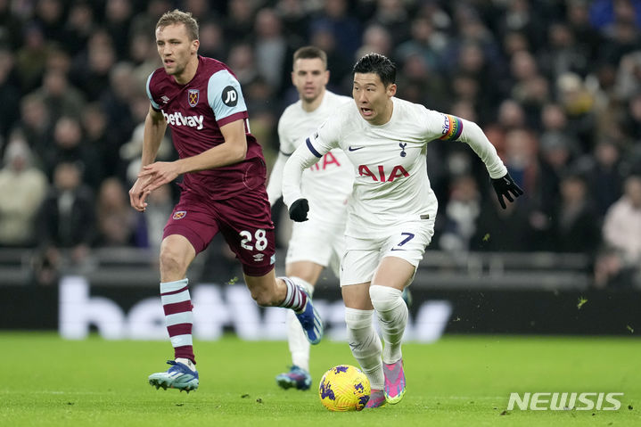 [런던=AP/뉴시스] 토트넘 홋스퍼의 손흥민이 7일(현지시각) 영국 런던의 토트넘 홋스퍼 스타디움에서 열린 2023-24 프리미어리그(EPL) 15라운드 웨스트햄과 경기 중 드리블하고 있다. 손흥민은 88분을 소화했고 토트넘은 1-2로 역전패하며 최근 5경기 1무 4패를 기록했다. 2023.12.08.