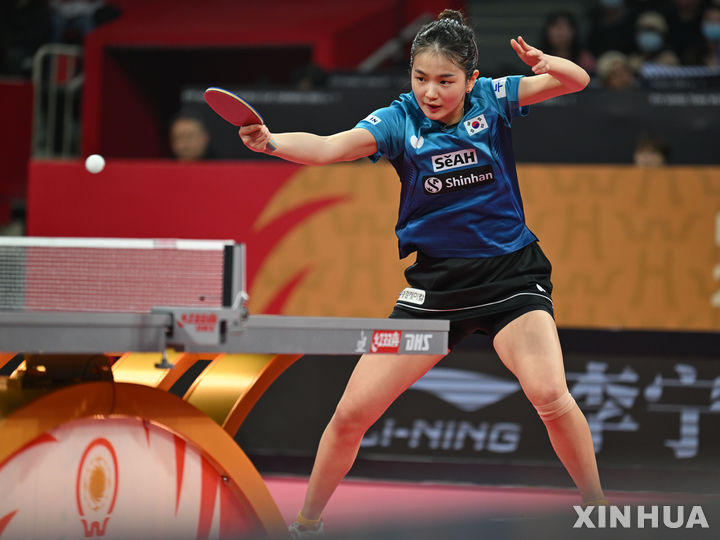 [청두=신화/뉴시스] 김나영이 8일(현지시각) 중국 쓰촨성의 청두에서 열린 '2023 국제탁구연맹(ITTF) 혼합 단체전 월드컵' 2회전 일본과의 2매치 여자 단식에서 하야타 히나와 경기하고 있다. 김나영이 1-2(8-11 11-9 5-11)로 패했으나 한국은 일본을 게임 스코어 8-4로 꺾어 5전 전승으로 9일 독일을 상대한다. 2023.12.09.