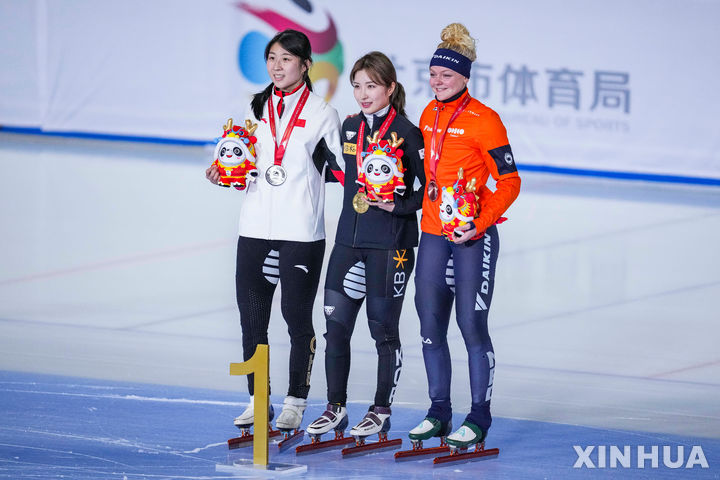 [베이징=신화/뉴시스] 김길리(가운데)가 9일(현지시각) 중국 베이징에서 열린 2023-24 국제빙상경기연맹(ISU) 쇼트트랙 월드컵 3차 대회 여자 1500m 정상에 올라 금메달을 목에 걸고 기념 촬영 하고 있다. 김길리는 2분25초830으로 중국의 궁리(2분26초142)를 여유롭게 따돌렸다. 2023.12.10.