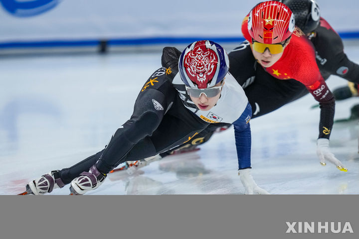 [베이징=신화/뉴시스] 김길리가 9일(현지시각) 중국 베이징에서 열린 2023-24 국제빙상경기연맹(ISU) 쇼트트랙 월드컵 3차 대회 여자 1500m 결승에서 역주하고 있다. 김길리는 2분25초830으로 중국의 궁리(2분26초142)를 여유롭게 따돌렸다. 2023.12.10.