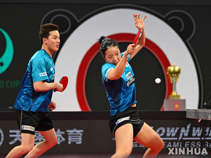 [청두=신화/뉴시스] 안재현과 신유빈이 10일(현지시각) 중국 쓰촨성의 청두에서 열린 '2023 국제탁구연맹(ITTF) 혼합 단체 월드컵' 중국과의 최종전 1복식에서 왕추친-쑨잉사 조와 경기하고 있다. 안재현-신유빈은 0-3(8-11 8-11 5-11)으로 완패했고 한국은 게임 스코어 1-8로 패해 준우승으로 대회를 마쳤다. 2023.12.11.