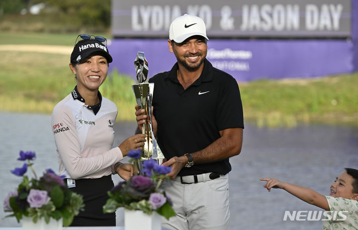 [네이플스=AP/뉴시스] 리디아 고(뉴질랜드, 왼쪽)와 제이슨 데이(호주)가 10일(현지시각) 미 플로리다주 네이플스의 티뷰론 골프클럽에서 열린 그랜트 손턴 인비테이셔널 정상에 올라 트로피를 함께 들고 포즈를 취하고 있다. 리디아 고와 데이는 1999년 JC페니클래식 이후 24년 만에 부활한 미국프로골프(PGA)·미국여자프로골프(LPGA) 혼성 대회에서 최종 합계 26언더파 190타로 초대 챔피언을 차지했다. 2023.12.11.