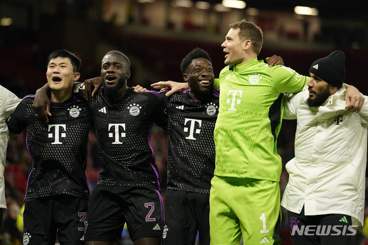 [맨체스터=AP/뉴시스] 바이에른 뮌헨의 김민재(왼쪽)가 12일(현지시각) 영국 맨체스터의 올드 트래퍼드 경기장에서 열린 2023-24시즌 유럽축구연맹(UEFA) 챔피언스리그(UCL) 조별리그 A조 최종전 맨체스터 유나이티드(맨유)와의 경기를 승리로 마친 후 동료들과 자축하고 있다. 김민재는 풀타임 활약했고 뮌헨은 1-0으로 승리, 조 1위로 16강 진출을 확정했다. 2023.12.13.