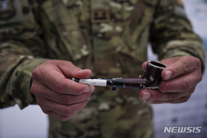 [산티아고=AP/뉴시스] 12일(현지시각) 한 칠레 군인이 산티아고의 주조 공장에서 경찰에 압수됐거나 자발적으로 반납한 무기들을 녹여 없애기 전 언론에 이를 공개하면서 담배 파이프 형태의 총기를 보여주고 있다. 가브리엘 보리치 대통령은 범죄조직에 유입되는 것을 막기 위해 총기류 약 2만5천 정을 폐기 처분했으며 이는 1990년 이후 가장 많은 양이라고 말했다. 2023.12.13.