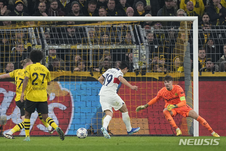 [도르트문트=AP/뉴시스] 파리 생제르맹(PSG)의 이강인(19)이 13일(현지시각) 독일 도르트문트의 지그날 이두나 파크에서 열린 2023-24 유럽축구연맹(UEFA) 챔피언스리그(UCL) 조별리그 F조 6차전 도르트문트와 경기 전반 18분 슛을 시도하고 있다. 이강인은 68분을 소화했고 PSG는 1-1로 비겨 조 2위로 16강에 올랐다. 2023.12.14.