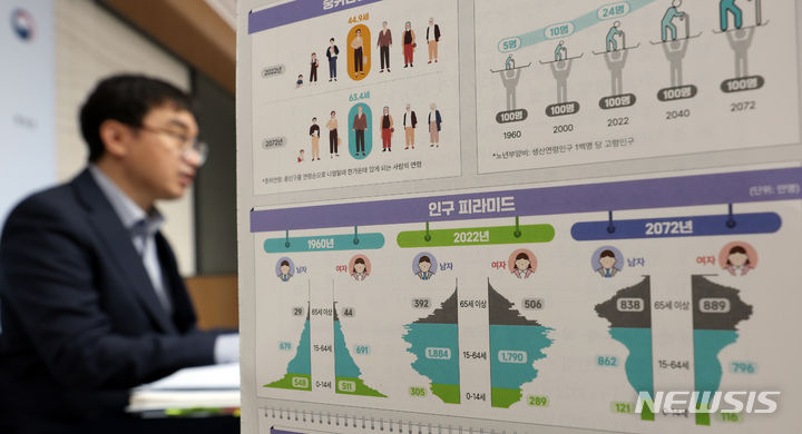 [세종=뉴시스] 강종민 기자 = 임영일 통계청 인구동향과장이 14일 세종시 정부세종청사에서 장래인구추계(2022년~2072년)를 발표하고 있다. 장래인구추계 결과 총인구는 2022년 5167만명에서 2072년 3622만명으로 줄어들고, 2022년부터 향후 10년간 생산연령인구는 332만명 감소, 고령인구는 485만명 증가하는 것으로 나타났다. 2023.12.14. [email protected]