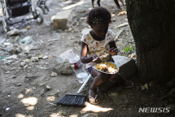 [리우데자네이루=AP/뉴시스] 16일(현지시각) 브라질 리우데자네이루의 자르징 그라마슈 빈민가에서 한 어린이가 브라질 축구팀 플라멩구가 기부한 조리 신발(일명 쪼리), 셔츠 등 크리스마스 선물 배급을 기다리며 음식을 먹고 있다. 2023.12.17.