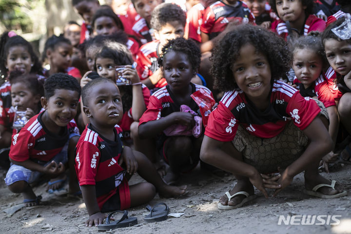 [리우데자네이루=AP/뉴시스] 16일(현지시각) 브라질 리우데자네이루의 자르징 그라마슈 빈민가 어린이들이 브라질 축구팀 플라멩구 유니폼을 입고 플라멩구가 기부한 조리 신발(일명 쪼리), 셔츠 등 크리스마스 선물 배급을 기다리고 있다. 2023.12.17.