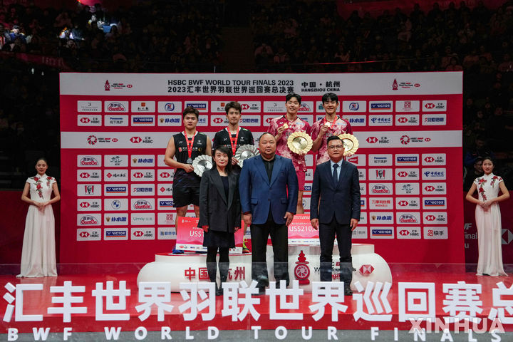 [항저우=신화/뉴시스] 서승재-강민혁(뒷줄 오른쪽)이 17일(현지시각) 중국 항저우에서 열린 2023 세계배드민턴연맹(BWF) 월드투어 파이널 남자 복식 정상에 올라 금메달을 목에 걸고 기념 촬영을 하고 있다. 서승재-강민혁 조(6위)는 결승에서 중국의 량웨이컹-왕창 조(1위)를 2-0(21-17 22-20)으로 완파하고 우승을 차지했다. 2023.12.18.