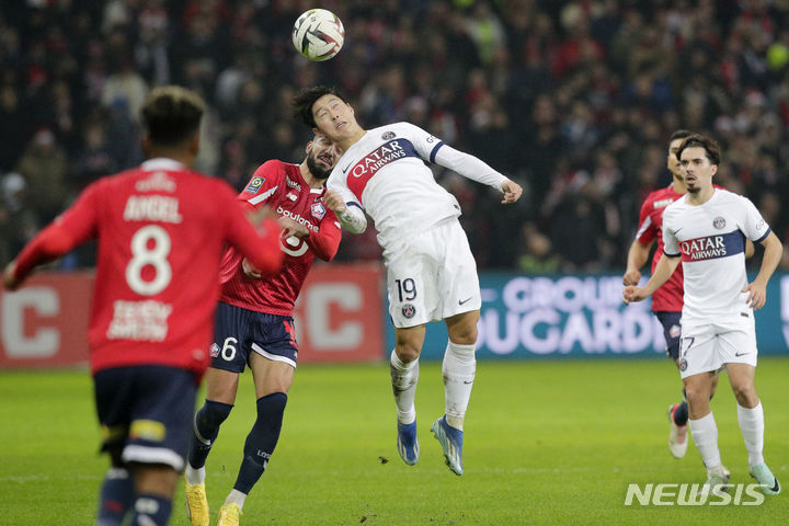 [빌뇌브다스크=AP/뉴시스] 파리 생제르맹(PSG)의 이강인이 17일(현지시각) 프랑스 빌뇌브다스크의 스타드 피에르 모루아에서 열린 2023-24 프랑스 리그1 16라운드 LOSC 릴과 경기 중 공중 볼을 다투고 있다. 이강인은 풀타임을 소화했고 PSG는 1-1로 비기며 리그 8연승을 마감했다. 2023.12.18.