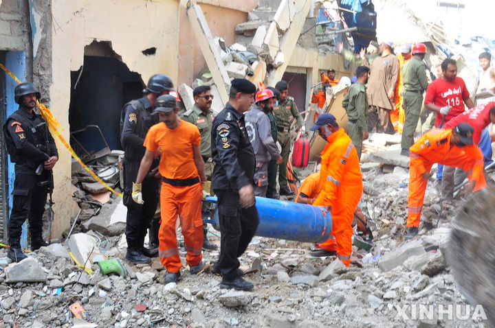 파키스탄 가스통 폭발 현장 수색하는 구조대