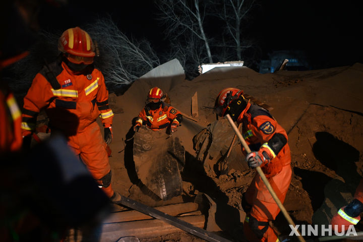 [하이둥=신화/뉴시스] 19일(현지시각) 중국 북서부 칭하이성 하이둥의 한 마을에서 구조대가 지진 피해 현장을 수색하고 있다. 현지 당국은 전날 저녁 간쑤성 린샤후이족자치주에서 규모 6.2의 강진이 발생해 간쑤성과 칭하이성에서 지금까지 최소 110명이 숨지고 200여 명이 다쳤다고 밝혔다. 2023.12.19.