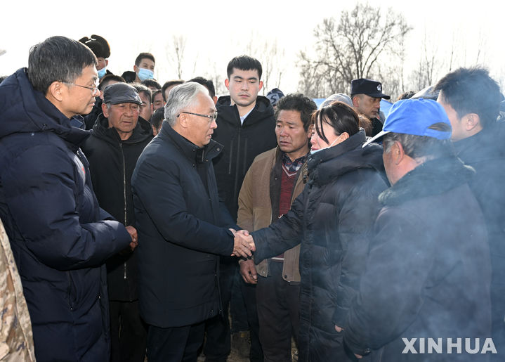 [지스산=신화/뉴시스] 장궈칭 중국 부총리가 19일(현지시각) 간쑤성 지스산현의 지진 피해 현장을 방문해 피해자들을 위로하고 있다. 장 부총리는 지진 구호와 피해 복구에 총력을 기울일 것을 지시했다. 2023.12.20.
