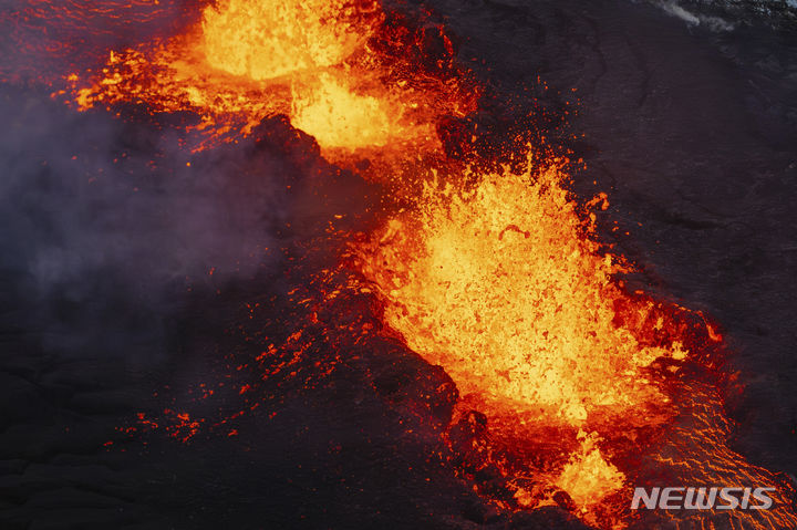 [레이캬네스=AP/뉴시스] 19일(현지시각) 아이슬란드 레이캬네스반도의 그린다비크 화산에서 용암이 분출하고 있다. 아이슬란드 기상청은 이날 오후 화산폭발로 인한 용암 분출의 규모가 감소하고 있다고 밝혔다. 한편, 화산이 분출하면서 때아닌 장관이 연출돼 이를 보려는 관광객들이 밀려드는 것으로 알려졌다. 2023.12.20.