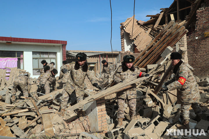 [지스산=신화/뉴시스] 20일(현지시각) 중국 서북부 간쑤성 지스산현 다허자 마을에서 군인들이 지진 피해 복구 작업을 하고 있다. 지난 18일 간쑤성에서 발생한 지진으로 지금까지 최소 131명이 숨지고 약 800명이 다친 것으로 나타났다. 현지 당국은 혹독한 추위 속 피해 주민들에게 화로, 텐트, 음식 등을 지원하는 등 구조와 구호 작업을 이어가고 있다. 2023.12.21.