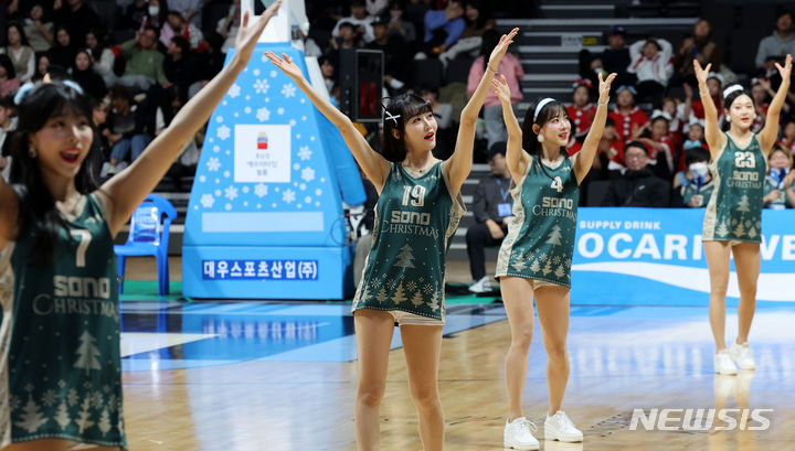 [고양=뉴시스] 홍효식 기자 = 24일 경기도 고양시 일산서구 고양 소노 아레나에서 열린 2023-2024 프로농구 고양 소노 스카이거너스와 울산 현대모비스 피버스의 경기, 소노 치어리더들이 크리스마스 스페셜 유니폼을 입고 응원하고 있다. 2023.12.24. [email protected]