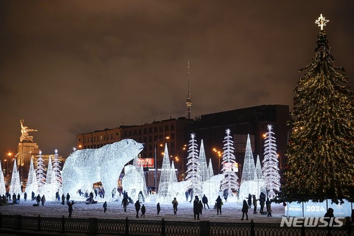 [모스크바=AP/뉴시스] 러시아 유명 조각가 베라 무히나의 새해와 크리스마스 축하 스테인리스 작품이 설치된 모스크바의 한 공원에서 24일(현지시각) 시민들이 즐거운 시간을 보내고 있다. 2023.12.25.