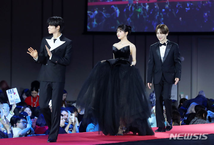 [인천=뉴시스] 김혜진 기자 = 가수 연준(왼쪽부터), 안유진, 키가 25일 오후 인천 중구 인스파이어 아레나에서 열린 '2023 SBS 가요대전' 시상식에서 레드카펫을 밟고 있다. 샤이니 키, 투모로우바이투게더 연준, 아이브 안유진이 MC를 맡은 '2023 SBS 가요대전'은 동방신기, 샤이니, NCT 127, NCT 드림, 더보이즈, 프로미스나인, 스트레이 키즈, (여자)아이들, 에이티즈, 있지, 투모로우바이투게더, 크래비티, 스테이씨, 에스파, 엔하이픈, 아이브, 엔믹스, 르세라핌, 뉴진스, 싸이커스, 보이넥스트도어, 제로베이스원, 라이즈, 니쥬, 앤팀까지 총 25팀이 출연한다. 2023.12.25. [email protected]