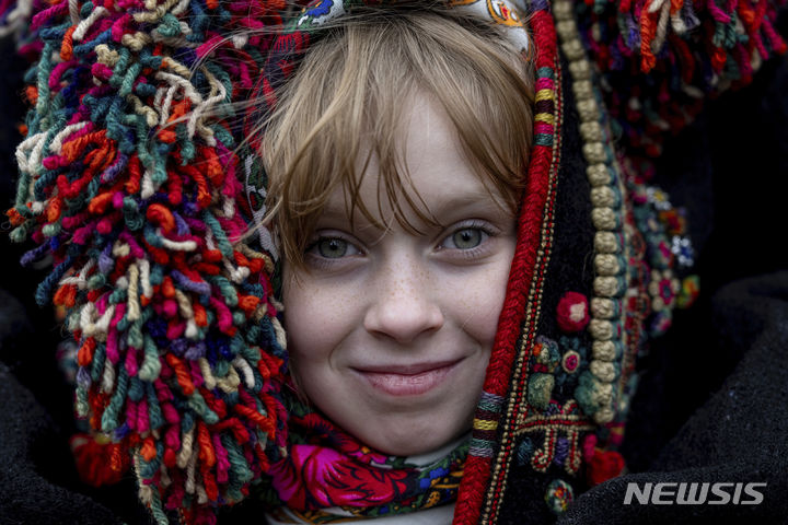 [크리보리브냐=AP/뉴시스] 25일(현지시각) 우크라이나 크리보리브냐 마을의 성당에서 크리스마스 축하 행사가 열리는 동안 한 소녀가 엄마의 전통 의상을 덮어쓰고 몸을 녹이고 있다. 우크라이나는 러시아와의 문화 및 종교 분리를 위해 크리스마스를 1월 7일에서 12월 25일로 공식 변경했다. 2023.12.26.