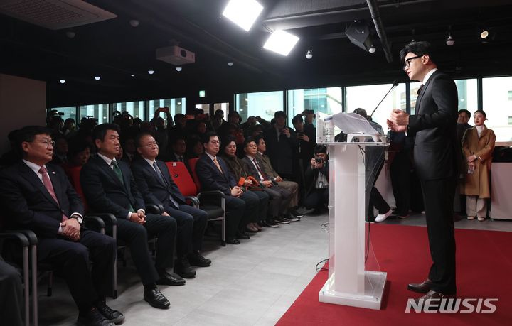 [서울=뉴시스] 조성봉 기자 = 한동훈 국민의힘 비상대책위원장이 26일 오후 서울 여의도 국민의힘 중앙당사에서 비상대책위원장 임명 수락 연설을 하고 있다. (공동취재) 2023.12.26. [email protected]