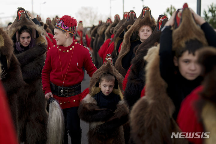 [라코바=AP/뉴시스] 26일(현지시간) 루마니아 북부 라코바 마을에서 곰 털 의상을 입은 어린이들이 마을 주민들을 위해 춤추기 전 행진하고 있다. 루마니아 '춤추는 곰 축제'는 동물 털을 입은 사람들이 집집이 다니며 노래하고 춤추면서 악을 물리치는 전통 풍습으로 기독교 이전 시대부터 유래한 것으로 알려졌다. 2023.12.27.