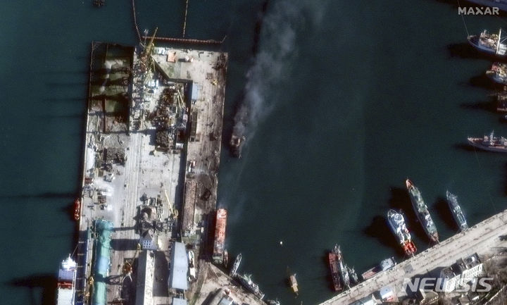 [크름반도=AP/뉴시스] 막사 테크놀로지스가 제공한 위성사진에 지난 26일(현지시각) 크름반도 동부 페오도시야항에 정박 중이던 러시아 로푸차급 상륙함 보체르카스크호가 우크라이나군의 공습으로 연기가 치솟고 있다. 크름반도 세르게이 악시오노프 행정장관은 이 공격으로 페오도시야에 화재가 발생했으며 1명이 숨지고 2명이 부상했다고 말했다. 2023.12.28.