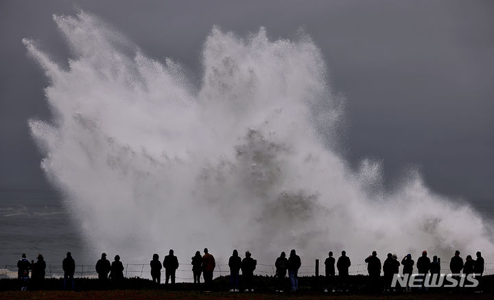 [카멧=AP/뉴시스] 28일(현지시각) 미 캘리포니아주 소노마카운티 카멧의 던컨스 랜딩 전망대에서 방문객들이 폭풍으로 인한 거대한 파도가 들이치는 모습을 바라보고 있다. 2023.12.29.